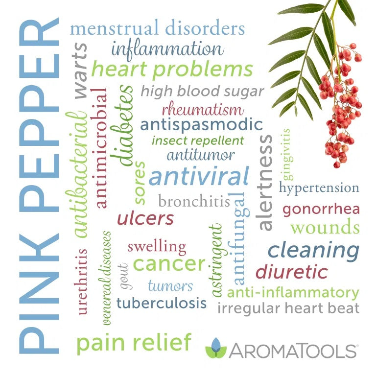Learn about pink pepper essential oil! Discover where it comes from and how it's commonly used. We review how to use the oil safely and its applications. Find out how to add pink pepper into your diffuser, your meditation practice and DIY recipes for digestive support, pain relief.