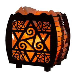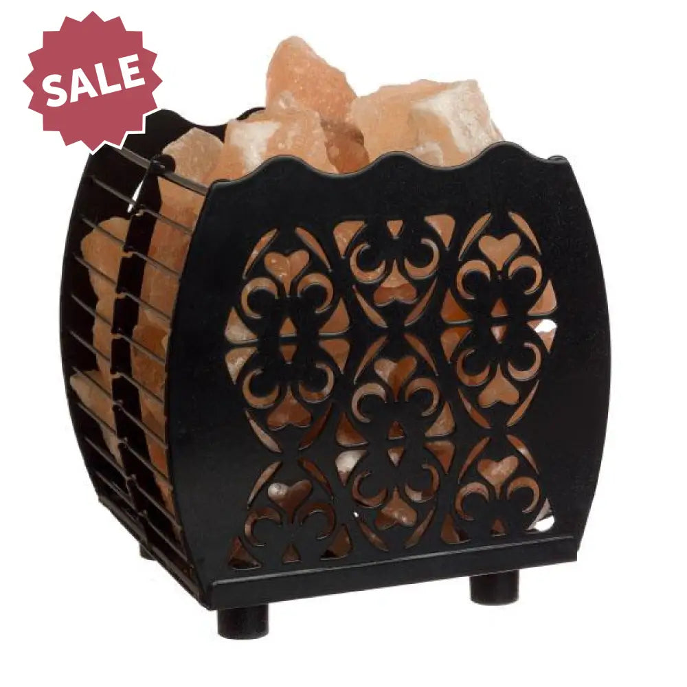 The decorative metal basket holds salt pieces around a heat-producing lamp.
